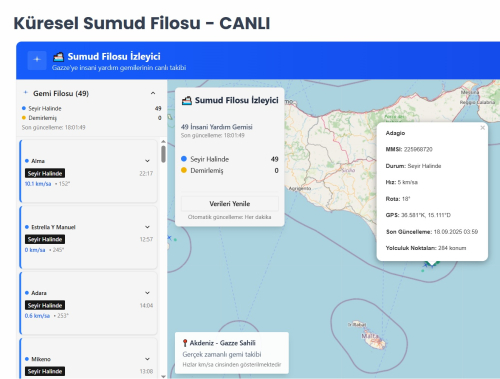 Sumud Filosu Nerede? Canlı Takip Sistemimiz Yayında! Sumud Filosu Gazze’ye insani yardım ulaştırmak için Akdeniz’de yol alıyor. Filonun anlık konumunu canlı takip edin ve destek olun. Devamı 18/09/2025
